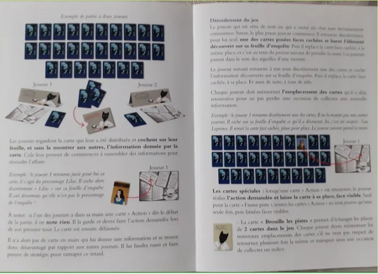 À chaque tour, relevez un nouvel indice, rayez les fausses pistes derrière votre chevalet et progressez dans l’enquête ! Il faut bien mémoriser où se situent les cartes déjà vues, car à tout moment elles peuvent changer de place et vous ralentir dans l’enquête via les cartes spéciales. Brouiller les pistes en échangeant deux cartes entre elles ou prendre de l’avance en utilisant un Indic !